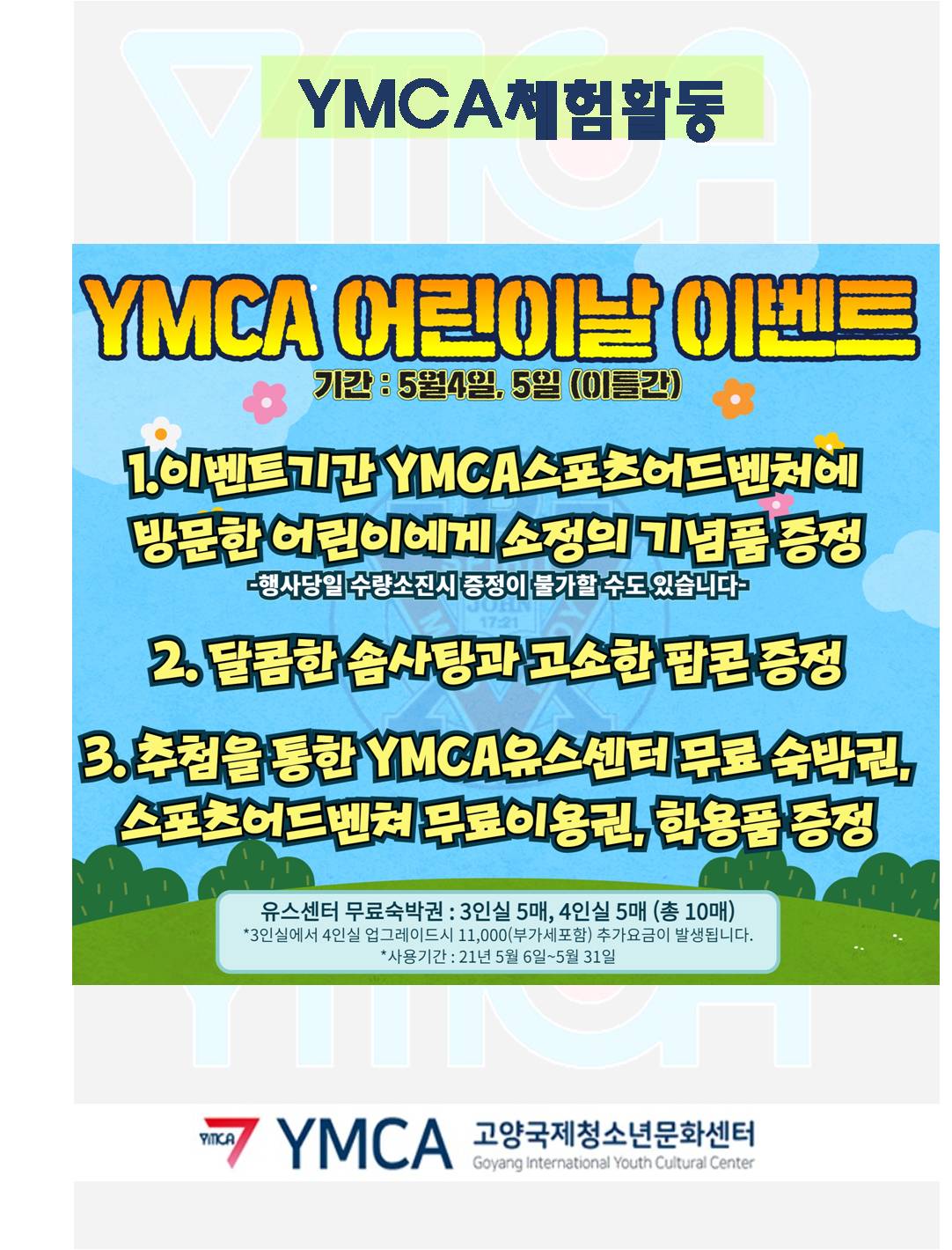 체험활동 '어린이날 이벤트' 등록일자2021-04-29 조회수4,071 YMCA체험활동(스포츠어드벤처/교통안전공원)에서 '어린이날 이벤트'를 실시합니다. 재미있는 이용과 함께 행운도 함께 얻어가시길 바랍니다. 문의사항은 031-900-4901로 전화주세요. 첨부파일 어린이날이벤트.jpg previous List
